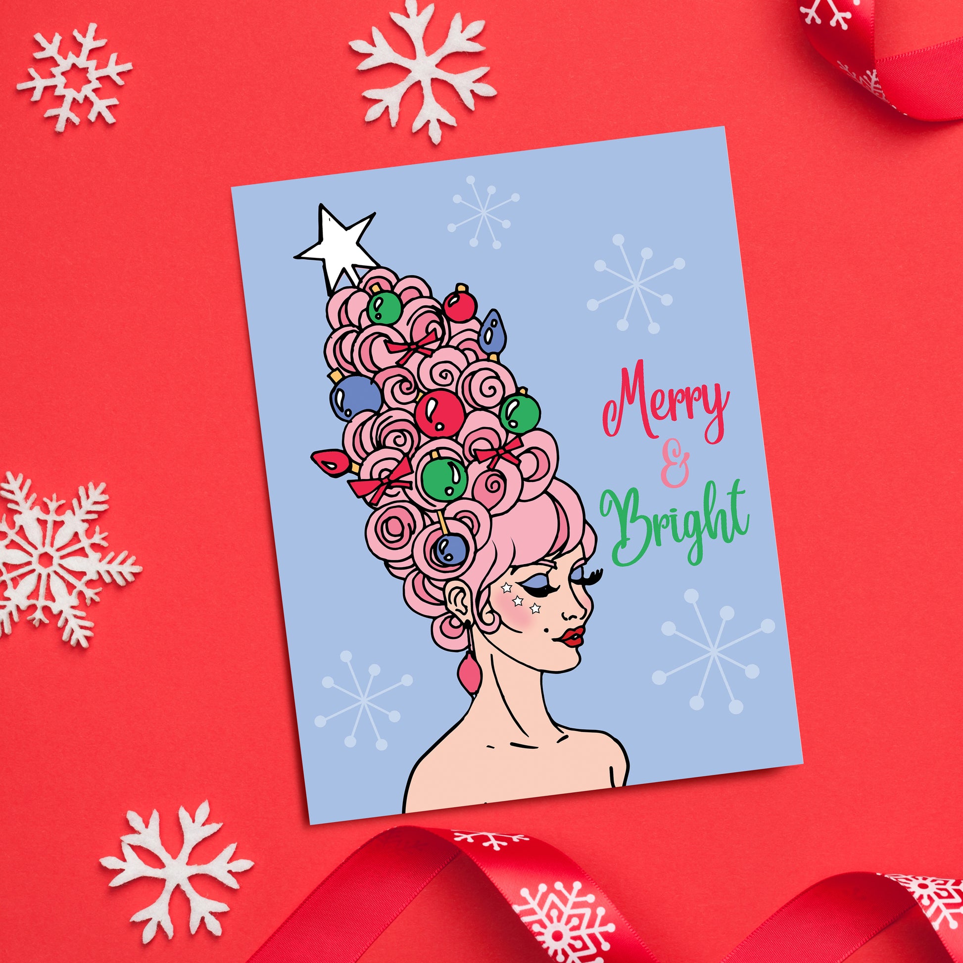 Nothing says festive like Christmas ornaments in your hair. Celebrate the holidays with our retro inspired Merry & Bright card!